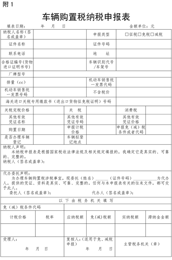 為落實《中華人民共和國車輛購置稅法》(以下簡稱《車購稅法》),規范車輛購置稅征收管理,現就有關事項公告如下: 一、車輛購置稅實行一車一申報制度。 二、《車購稅法》第六條第四項所稱的購置應稅車輛時相關憑證,是指原車輛所有人購置或者以其他方式取得應稅車輛時載明價格的憑證。無法提供相關憑證的,參照同類應稅車輛市場平均交易價格確定其計稅價格。無同類應稅車輛市場平均交易價格的,由稅務機關依據《中華人民共和國稅收征收管理法》(以下簡稱《稅收征管法》)及其實施細則核定其應納稅額。 原車輛所有人為車輛生產或者銷售企業,未開具機動車銷售統一發票的,按照車輛生產或者銷售同類應稅車輛的銷售價格確定應稅車輛的計稅價格。無同類應稅車輛銷售價格以及同類應稅車輛無銷售價格的,按照組成計稅價格確定應稅車輛的計稅價格。 三、購置應稅車輛的納稅人,應當到下列地點申報納稅: (一)需要辦理車輛登記的,向車輛登記地的主管稅務機關申報納稅; (二)不需要辦理車輛登記的,單位納稅人向其機構所在地主管稅務機關申報納稅,個人納稅人向其戶籍所在地或者經常居住地的主管稅務機關申報納稅。 四、《車購稅法》第十二條所稱納稅義務發生時間,按照下列情形確定: (一)購買自用應稅車輛的為購買之日,即車輛相關價格憑證的開具日期; (二)進口自用應稅車輛的為進口之日,即《海關進口增值稅專用繳款書》或者其他有效憑證的開具日期; (三)自產、受贈、獲獎或者以其他方式取得并自用應稅車輛的為取得之日,即合同、法律文書或者其他有效憑證的生效或者開具日期。 五、納稅人辦理納稅申報時應當如實填報《車輛購置稅納稅申報表》(附件一,以下簡稱《納稅申報表》),同時提供車輛合格證明和車輛相關價格憑證。 六、納稅人在辦理車輛購置稅免稅、減稅時,除按本公告第五條規定提供資料外,還應當根據不同的免減稅項目,分別提供以下資料的原件或者復印件: (一)外國駐華使館、領事館和國際組織駐華機構及其有關人員自用車輛,提供機構證明和外交部門出具的身份證明。 (二)城市公交企業購置的公共汽電車輛,提供所在地縣級以上(含縣級)交通運輸主管部門出具的公共汽電車輛認定表。 (三)懸掛應急救援專用號牌的國家綜合性消防救援車輛,提供中華人民共和國應急管理部批準的相關文件。 (四)回國服務的在外留學人員購買的自用國產小汽車,提供海關核發的《中華人民共和國海關回國人員購買國產汽車準購單》。 (五)長期來華定居專家進口自用小汽車,提供國家外國專家局或者其授權單位核發的專家證或者A類和B類《外國人工作許可證》。 七、免稅、減稅車輛因轉讓、改變用途等原因不再屬于免稅、減稅范圍的,納稅人在辦理納稅申報時,應當如實填報《納稅申報表》。發生二手車交易行為的,提供二手車銷售統一發票;屬于其他情形的,按照相關規定提供申報材料。 八、已經繳納車輛購置稅的,納稅人向原征收機關申請退稅時,應當如實填報《車輛購置稅退稅申請表》(附件二,以下簡稱《退稅申請表》),除提供納稅人身份證明外,還應當按照下列情況分別提供以下資料: (一)車輛退回生產企業或者銷售企業的,提供生產企業或者銷售企業開具的退車證明和退車發票。 (二)其他依據法律法規規定應當退稅的,根據具體情形提供相關資料。 九、納稅人應如實申報應稅車輛的計稅價格。 納稅人沒有編造虛假計稅依據的,稅務機關按照其申報的計稅價格征收稅款;納稅人編造虛假計稅依據的,稅務機關依照《稅收征管法》及其實施細則的相關規定處理。 十、稅務機關追繳稅款時,納稅人無法按照規定提供申報資料的,可以依據司法、審計、財政等有關機關的文書,為其辦理補稅手續。 十一、本公告要求納稅人提供的資料,稅務機關能夠通過政府信息共享等手段獲取相關資料信息的,納稅人不再提交。 十二、本公告所稱的納稅人身份證明:單位納稅人為《統一社會信用代碼證書》或者營業執照或者其他有效機構證明,個人納稅人為居民身份證或者居民戶口簿或者入境的身份證件。 本公告所稱車輛合格證明為整車出廠合格證或者車輛電子信息單。 本公告所稱車輛相關價格憑證,境內購置車輛為機動車銷售統一發票或者其他有效憑證,進口自用車輛為《海關進口關稅專用繳款書》或者海關進出口貨物征免稅證明。屬于應征消費稅車輛的還包括《海關進口消費稅專用繳款書》。 十三、稅務機關應當在稅款足額入庫或者辦理免稅手續后,將應稅車輛完稅或者免稅電子信息,及時傳送給公安機關交通管理部門。 上款所指稅款足額入庫的情形包括:納稅人到銀行辦理車輛購置稅稅款繳納(轉賬或者現金)由銀行將稅款繳入國庫的,國庫已傳回《稅收繳款書(銀行經收專用)》聯次;納稅人通過橫向聯網電子繳稅系統等電子方式繳納稅款的,稅款劃繳已成功;納稅人在辦稅服務廳以現金方式繳納稅款的,主管稅務機關已收取稅款。 十四、納稅人名稱、車輛廠牌型號、發動機號、車輛識別號、證件號碼等應稅車輛完稅或者免稅電子信息與原申報資料不一致的,納稅人可以到稅務機關辦理完稅或者免稅電子信息更正,但是不包括以下情形: (一)車輛識別代號(車架號)和發動機號同時與原申報資料不一致。 (二)完稅或者免