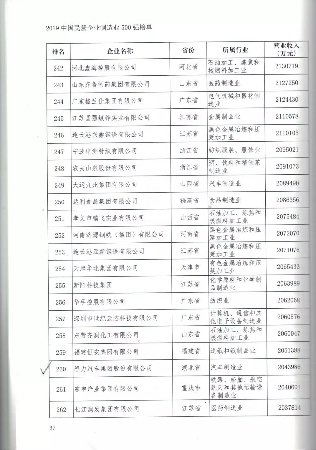 湖北程力汽車集團(tuán)入選2019年中國民企500強及中國民企制造業(yè)500強榮譽榜單