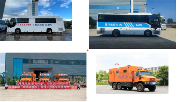 1至2幀為程力汽車集團在后疫情時期,集中專汽及應急裝備的技術優勢,率先研發出移動方艙醫院、大型醫療體檢車(國家疫苗接種車);3至4幀為程力汽車集團于2021年擔綱研發的四驅航天員地接醫監醫保醫療專用車,成功保障神州十二返航的三名航天英雄。