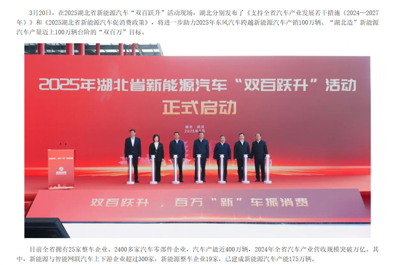 3月19日 (下午)三部門聯(lián)合升級貨車更新政策:交通運輸部、發(fā)改委、財政部將老舊貨車補貼范圍擴展至國三/國四排放車輛,取消燃料類型限制。根據(jù)新規(guī),提前報廢并更換新能源貨車的企業(yè)最高可獲14萬元/車補貼,購置國六車型補貼7萬元。政策特別設(shè)置"綠色通道",對參與氫燃料電池車示范運營的企業(yè)額外給予3萬元運營補貼。支持資金按照總體9:1的原則實行央地共擔(dān)。 3月20日 湖北省確定汽車產(chǎn)業(yè)“雙百萬”目標 湖北省分別發(fā)布了《支持全省汽車產(chǎn)業(yè)發(fā)展若干措施(2024—2027年)》和《2025湖北省新能源汽車促消費政策》,將進一步助力2025年“湖北造”新能源汽車產(chǎn)量邁上100萬輛臺階的目標。 3月21日 大同構(gòu)建新能源商用車生態(tài)圈 3月29日 央企重組開啟產(chǎn)業(yè)新格局 3月,財政部的扶持政策不僅延長了購置稅減免期限,還加大了對充換電基礎(chǔ)設(shè)施和智能網(wǎng)聯(lián)技術(shù)的投入,為新能源專用車的市場推廣和基礎(chǔ)設(shè)施建設(shè)提供了有力保障。此外,三部門聯(lián)合升級的貨車更新政策,提供了豐厚的補貼,將促進新能源專用車的銷售。湖北省確定汽車產(chǎn)業(yè)“雙百萬”目標不僅為當(dāng)?shù)?/span>提供了政策支持和市場需求保障,還促進了產(chǎn)業(yè)鏈的協(xié)同發(fā)展和新能源專用車的普及推廣。這一系列政策將有助于推動新能源專用車產(chǎn)業(yè)的快速發(fā)展和壯大。 |