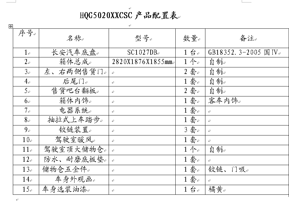 1.車廂頂部封閉選裝通風(fēng)窗時(shí),高2590mm;選裝頂置空調(diào)時(shí),高2890 mm.2左右兩側(cè)及后部均可選裝led屏、廣告滾軸燈箱、玻璃窗或上掀門。3.該車前部頂端兩側(cè)裝有喇叭,可進(jìn)行聲音宣傳.4.該車裙邊工具箱艙門可選裝.5.側(cè)部和后下部防護(hù)裝置為鋼板整體式側(cè)圍防護(hù)結(jié)構(gòu),離地高度300mm,側(cè)部和后下部防護(hù)裝置材料材質(zhì)為Q235A.發(fā)動(dòng)機(jī)型號(hào)/最大凈功率(kw)分別為:JL466Q1/46.56;6.可以選裝不同車體顏色和外觀貼畫(huà).