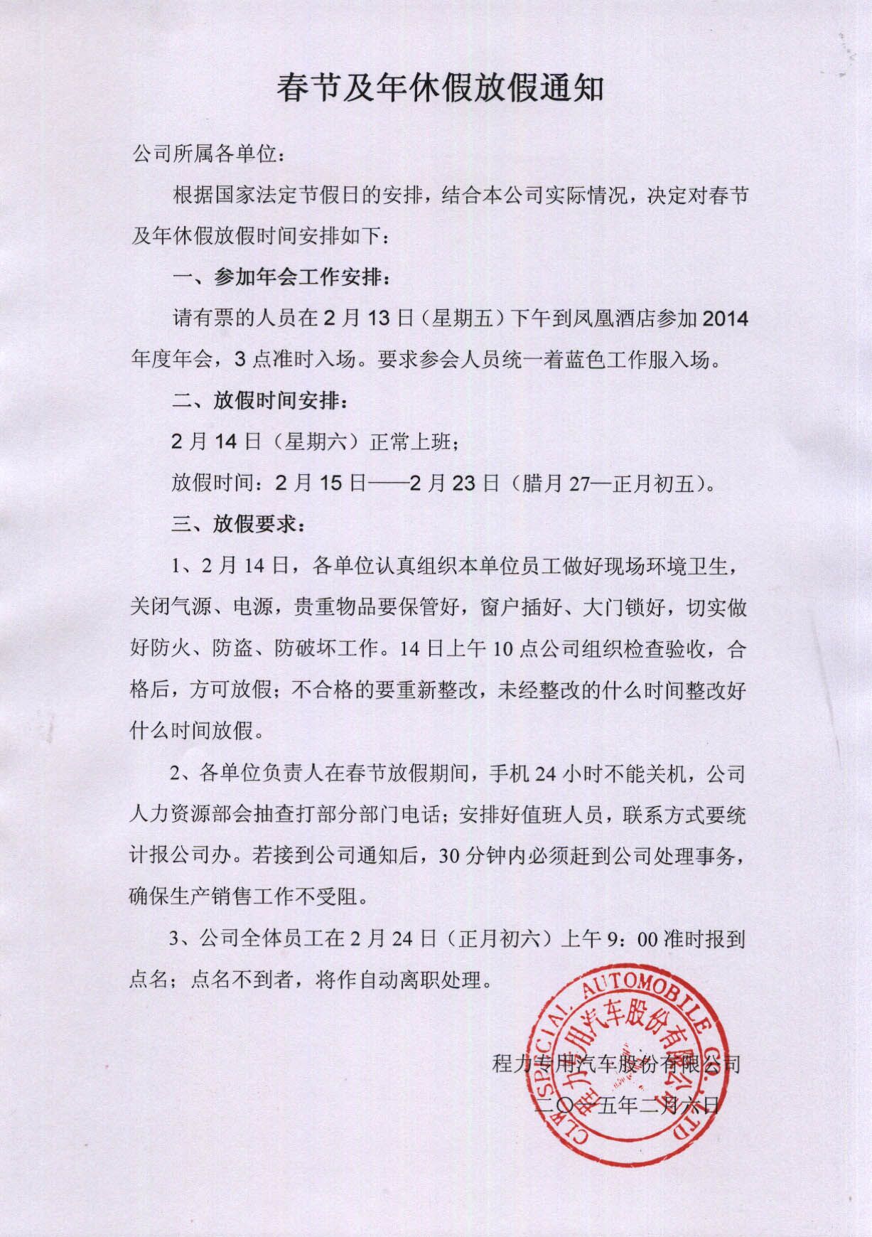 | 辭舊迎新的時刻就要來臨,湖北程力汽車銷售部感謝有你,坎坷的2014終于完美收官,讓我們一起迎接美好的 ️ ️ ️ ️!感謝那些一直支持丶幫助我的朋友們和同事,與其新老顧客們,在新的一年我將用更優(yōu)質(zhì)的服務(wù)回報您的支持與信任!新年到來之際祝所有朋友及其家人新的一年五羊 開泰,幸福安康、事業(yè)更上一層樓!在此祝新老顧客過個愉快的新春佳節(jié),歡迎來電咨詢:0722-7029866.18672222488 2015年湖北程力春節(jié)公司放假安排如下: 一、公司定于2015年2月13日下午3:30準(zhǔn)時到鳳凰大酒店參加2014年度工作總結(jié)表彰大會,暨2015新年團(tuán)拜會,要求參會人員統(tǒng)一著裝藍(lán)色工作服入場,服從會場指揮人員的安排,遵守會場紀(jì)律。 二、公司定于2015年2月15日(臘月27)正式放假,2月24日(正月初六)上午9:00準(zhǔn)時報到點(diǎn)名,點(diǎn)名不到者,將作自動離職處理。 三、2月15日(農(nóng)歷臘月二十七),各單位認(rèn)真組織本單位員工做好現(xiàn)場環(huán)境衛(wèi)生,做到設(shè)備干凈無油污、無灰塵,安全通道暢通,地面衛(wèi)生清潔整潔,電器電源關(guān)閉,貴重物品要保管好,鎖好車間大門,要做好防火、防盜、防破壞工作。公司組織檢查驗(yàn)收合格后,方可放假。 四、各單位負(fù)責(zé)人在春節(jié)放假期間,手機(jī)24小時不能關(guān)機(jī),安排好值班人員,聯(lián)系方式要統(tǒng)計。若接到公司通知后,30分鐘內(nèi)必須趕到公司處理事務(wù),確保生產(chǎn)銷售工作不受阻。 ![]() 放假期間,請大家一定要注意人身安全,并按時返回,如遇非人為原因無法按時返回,請及時向主管部門告假。最后衷心祝愿大家過個歡樂、祥和的春節(jié),羊年年平安順利快樂健康!全家喜洋洋!!! |