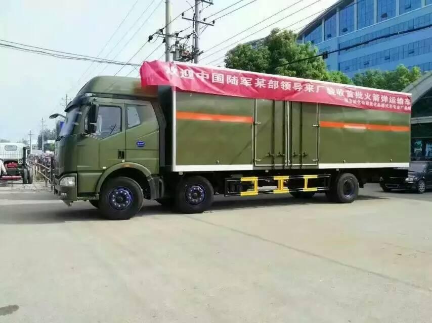 導讀:程力油化分公司危化品廂式車廠順利交付了首批9.6米火箭彈運輸車輛,過硬的品質贏得了中國人民解放軍陸軍某部首長和隨行領導的一致認可,本次訂單從前期商務談判,…