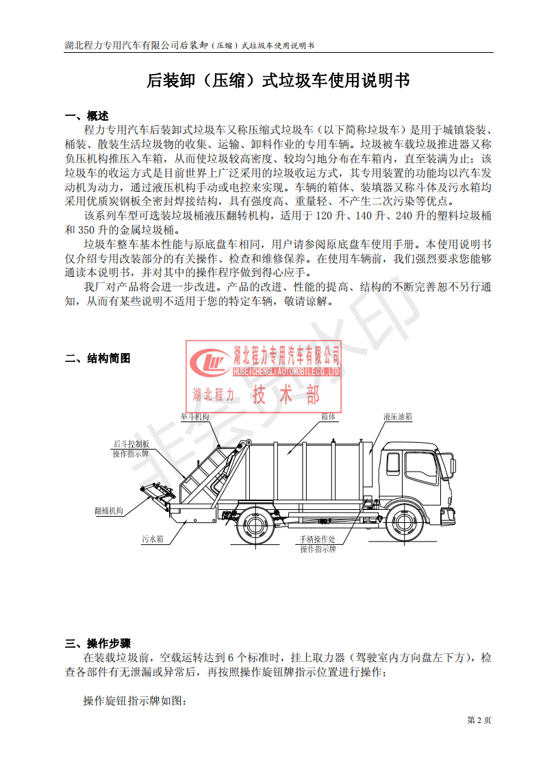 湖北程力壓縮垃圾車由密封式垃圾廂、液壓系統、操作系統組成。壓縮垃圾車整車為全密封型,自行壓縮、自行傾倒、壓縮過程中的污水全部進入污水廂,較為徹底的解決了壓縮車運輸過程中的二次污染的問題,關鍵部件采用進口部件,具有壓力大、密封性好、操作方便、安全等優點。