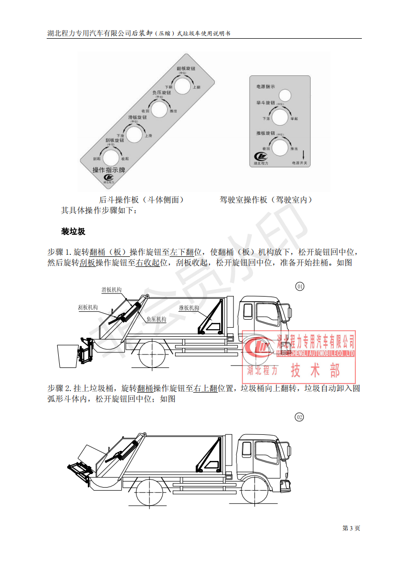 湖北程力壓縮式垃圾車:采用機電液一體化技術,采用機、電、液聯合自動控制系統,通過車廂、填裝器、推鏟等專用裝置,實現垃圾裝入、壓碎或壓扁、強力裝填,最后將垃圾壓實擠入車廂,運到目的地進行自動推動卸載。其突出特點:垃圾收集方式簡便、高效、具有反復壓縮及蠕動壓縮等功能,壓縮比高,裝載質量大,作業自動化,動力性、環保性好,整車利用效率高。