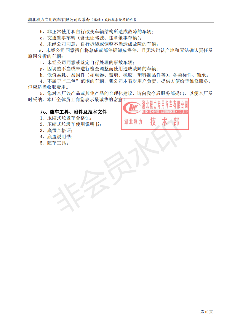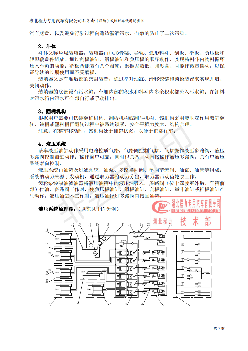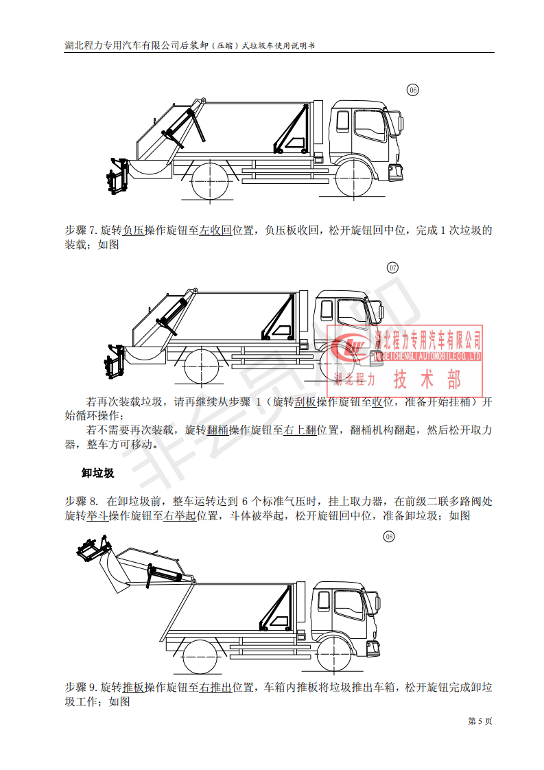 湖北程力壓縮垃圾車為全密封型,壓縮過程中的污水直接進入污水廂,徹底解決垃圾運輸過程中的二次污染,關鍵部件選用進口部件。