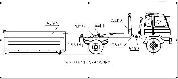 拉臂式垃圾車(車廂可卸式垃圾車)使用說明 一、概述 什么是勾臂垃圾車? 車廂可卸式垃圾車又稱拉臂式垃圾車(以下簡稱垃圾車)是用于城鎮(zhèn)袋裝、散裝生活垃圾物的收集、運輸、卸料作業(yè)的專用車輛。 該車是由汽車底盤、拉臂主油缸、附車架、翻轉(zhuǎn)架、支撐腿(選裝)、鎖緊架、鎖緊油缸及多路換向閥等組成。翻轉(zhuǎn)架一端連在附車架上,其另一端設(shè)有活動拉臂,中間安裝有鎖緊系統(tǒng);活動臂油缸一端連在活動臂上,另一端連接在附車架上;鎖緊機構(gòu)通過鎖緊油缸的動作可以在箱體自卸時將附車架上的箱體與翻轉(zhuǎn)架及拉臂連為一體,在主油缸伸出時形成自卸角,也可以通過鎖緊油缸的收回把翻轉(zhuǎn)架與附車架鎖緊為一體,利用主油缸的收回或伸出使活動拉臂將地下的垃圾箱拖拉至附車架上或從附車架上放回到地面。 該車可將地下垃圾箱內(nèi)的垃圾及垃圾箱一同拉至車上運走同時可自卸,降低了工人的勞動強度。該垃圾車的收運方式是目前世界上廣泛采用的垃圾收運方式,可以實現(xiàn)一車多箱,大大降低了配備成本和空間等等;其專用裝置的功能均以汽車發(fā)動機為動力,通過液壓機構(gòu)手動或電控來實現(xiàn)。車輛的箱體采用優(yōu)質(zhì)炭鋼板全密封焊接結(jié)構(gòu),具有強度高、重量輕、不產(chǎn)生二次污染等優(yōu)點。 二、結(jié)構(gòu)簡圖 三、操作步驟 在裝載垃圾前,空載運轉(zhuǎn)達到6個標準氣壓時,掛上取力器(駕駛室內(nèi)方向盤左下方),檢查各部件有無泄漏或異常后,再按照操作指示牌指示位置進行操作;其具體操作步驟如下: 拉起垃圾箱體 步驟1.將鎖緊鉤操作手柄推至收回位置,鎖緊油缸收回,使鎖緊架收回并將翻轉(zhuǎn)架與附車架鎖緊固定;如圖: 步驟2.將拉臂操作手柄拉起到伸起位置,拉臂油缸伸出,活動拉臂繞翻轉(zhuǎn)翻轉(zhuǎn)架前鉸鏈軸旋轉(zhuǎn),拉臂處于鉤箱位置,適當調(diào)整拉臂鉤高度并與箱體彎鉤對準;如圖: