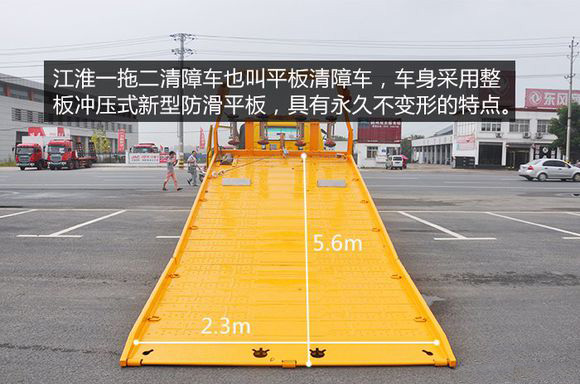 江淮平板一拖二清障車也叫江淮平板清障車,車身采用整板沖壓式新型防滑平板,具有永久不變形的特點(diǎn)。平板長(zhǎng)5.6米,寬2.3米,平板承載量為4噸,一般的家用轎車都能輕松拖起。