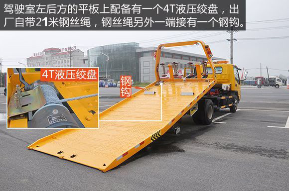 駕駛室左后方的平板上配備有一個(gè)4T液壓絞盤(pán),出廠自帶25米鋼絲繩,鋼絲繩另外一端接有一個(gè)鋼鉤,便于拖車時(shí)進(jìn)行牽引。