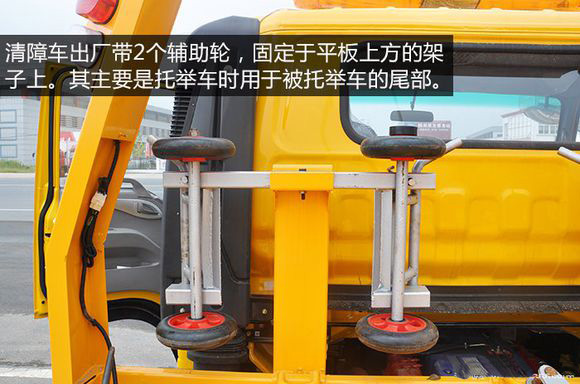江淮平板一拖二清障車出廠帶2個(gè)輔助輪,固定于平板上方的架子上。其主要是托舉車時(shí)用于被托舉車的尾部。