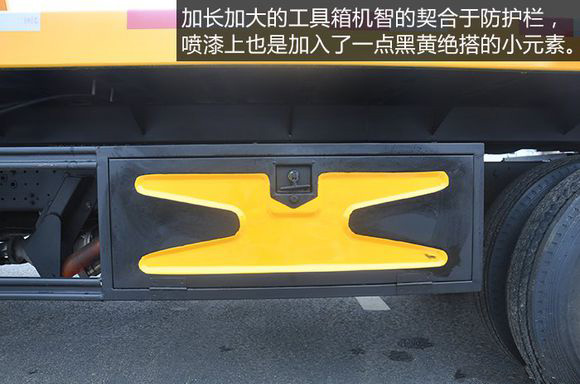 加長(zhǎng)加大的工具箱機(jī)智的契合于防護(hù)欄,噴漆上也是加入了一點(diǎn)黑黃絕搭的小元素,絲毫不顯突兀,完美的融入整車色調(diào)。