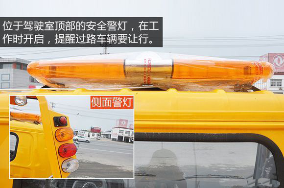位于駕駛室頂部的安全警燈,在工作時(shí)開(kāi)啟,提醒過(guò)路車輛要讓行,另外平板上方的架子左右各加裝有長(zhǎng)排24V電子安全警示燈,進(jìn)一步的加強(qiáng)了安全性。