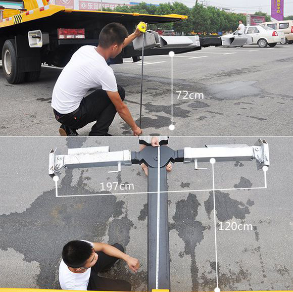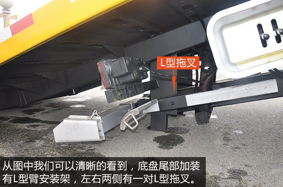 從圖中我們可以清晰的看到,底盤(pán)尾部加裝有L型臂安裝架,左右兩側(cè)有一對(duì)L型拖叉,其作用主要是托舉車輛時(shí),能抱緊輪胎,防止輪胎滑落。