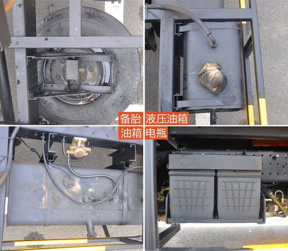 我們?cè)賮?lái)看看底盤(pán)上各零部件的分配,電瓶置于駕駛室左后方,與之對(duì)應(yīng)的右后方是油箱,油箱后方則是液壓油箱,緊隨其后的就是備胎。各零部件在不影響美觀的前提下,分配合理,實(shí)用性也很強(qiáng)。