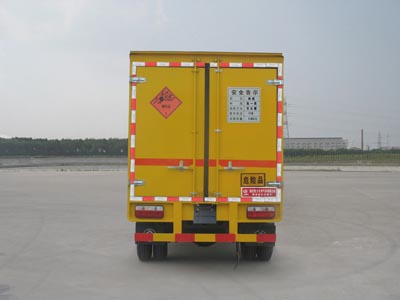 廂體頂部封閉,不可開啟:側/后防護裝置材料材質為Q235A碳鋼,側防護與副梁,后防護裝置與車架均采用焊接連接,后防護斷面尺寸(寬×高)50×120(mm),離地高度為450mm.運輸品名:炸藥,雷管,煙花爆竹等,類項號:1.1B,1.1D,1.1G,1.2G,1.3G,1.4G 等;安裝帶衛星定位功能的行駛記錄儀;配裝限速裝置,最高時速80km/h。僅采用有前盤制動器和安裝ABS的底盤。僅采用子午線輪胎(輪胎型號:7.00R16 8PR,6.50R16 10PR輪胎)。ABS生產廠家:東風電子科技股份有限公司制動系統公司;型號:36JD01-30010。僅采用排氣管前置的底盤。僅采用YC4F90-40,CY4102-CE4F,YN33CR2,SD4BW754U,4B28BTCI發動機,對應油耗值分別為12.88,12.92,12.54,12.74,12.87。隨底盤選裝駕駛室。
