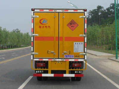 湖北程力專用汽車股份有限公司生產的爆破器材運輸車 廂體:為雙層金屬骨架結構,外部為冷扎鋼板,內壁采用鋁合金板蒙面,夾層為隔熱阻燃材料填充。設置對開門,如需安裝抗暴容器則增開側門,側壁設有防雨功能自然通風窗口,底部鋪有阻燃導靜電膠板,保證安全。廂體內部前面和側面裝有固定拉環,與捆綁帶使用捆綁貨物以避免移動。