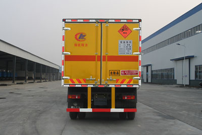 湖北程力專用汽車股份有限公司生產的爆破器材運輸車 廂體:為雙層金屬骨架結構,外部為冷扎鋼板,內壁采用鋁合金板蒙面,夾層為隔熱阻燃材料填充。設置對開門,如需安裝抗暴容器則增開側門,側壁設有防雨功能自然通風窗口,底部鋪有阻燃導靜電膠板,保證安全。廂體內部前面和側面裝有固定拉環,與捆綁帶使用捆綁貨物以避免移動。