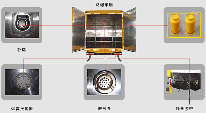 1、廂體部分:廂體為雙層金屬骨架結構,外部為冷扎鋼板,內壁采用鋁合金板蒙面,夾層為隔熱阻燃材料填充。設置對開門,側壁設有防雨功能自然通風窗口,以使廂內外空氣流動,廂體內部做防靜電處理,廂體底部與廂內前部鋪有阻燃導靜電膠板,并與底盤等電位連接,通過車輛后端的導靜電裝置與大地相連,可防止靜電火花的產生和車輛靜電及時釋放,提高易燃氣體廂式運輸車的安全性。廂體內部前面和側面裝有固定拉環,與捆綁帶使用捆綁貨物以避免移動,保證安全。