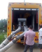4臺便攜式超輕型高速不銹鋼高頻率防腐蝕潛水泵,總流量可達1600立方每小時,單臺水泵功率為22KW,揚程為8M,單臺水泵配直徑為200MM消防式水管2根,每根長度為25米。