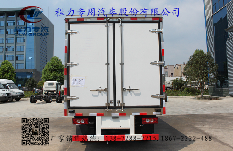 車廂頂部封閉,不可開啟.選裝排半駕駛室,選裝液壓尾板,選裝單/雙側開門,側開門可取消,選裝導流罩.選裝同等功率制冷機組,外觀形狀可不同.側防護的連接方式是與貨箱橫梁螺栓連接,側防護材料為冷板B-2.0;后防護連接方式是與車架縱梁螺栓連接,后下部防護裝置材料為異型管20-D.后部防護裝置截面尺寸100×50mm,后防護距離車輛離地的高430mm.