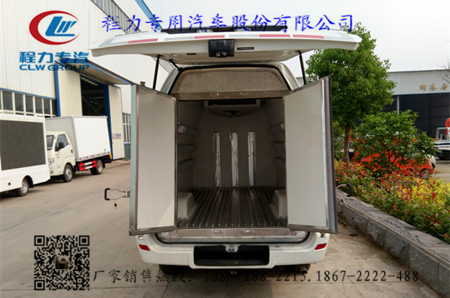 2.冷藏廂體配置:整車尺寸:長5.4米×寬1.69米×高2.225/2.425米,冷藏廂內部有效尺寸:長約2.9米×下寬1.38米×高1.45米,實際容積約5.5立方,冷藏廂蒙皮材料采用內玻璃鋼(選擇內不銹鋼),8cm聚氨酯保溫,配后雙開門(雙層門),不銹鋼門鎖件,花紋鋁底板或者玻璃鋼底板,底板安裝T型材鋁合金通風槽,前后左右廂板安裝不銹鋼通風槽(選裝鋁型材通風槽),安裝國產或者美國進口-5~25度雙溫制冷機組(夏天制冷,冬天加熱,無論什么季節都可以保持貨廂溫度恒溫在2~8度),安裝帶打印、上傳、數據存儲、超限報警,GPS定位功能的溫濕度報警儀,符合GSP認證要求。