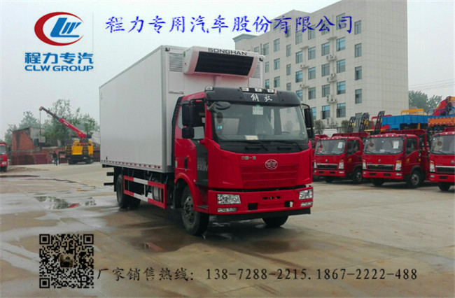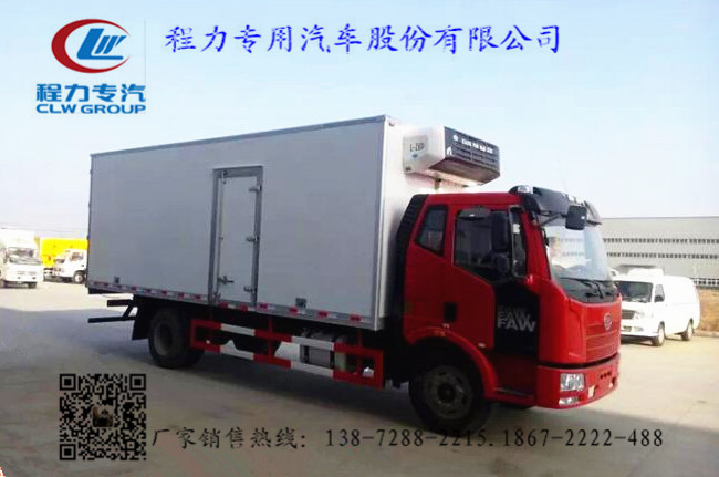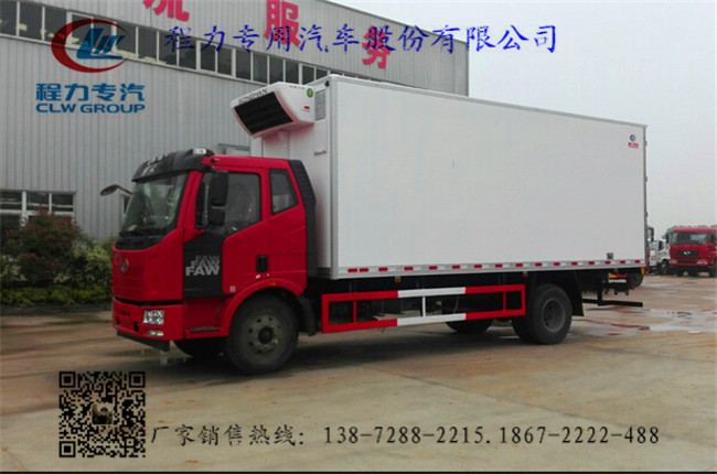 2.上裝配置:冷藏廂體內部有效尺寸:長6.8米×寬2.35米×高2.4米米,廂體蒙皮采用內外玻璃鋼,隨客戶選擇內置槽鋼焊接骨架或者玻璃纖維超輕高強度骨架,填充8cm聚氨酯保溫層,不銹鋼包角,不銹鋼門框,不銹鋼門鎖件,防滑花紋鋁底板選裝T型材通風槽,導軌,肉鉤,配后雙開門,車廂右側可以加開側門,-5~-18度非獨立制冷機組,選裝合資或者原裝美國進口獨立機組