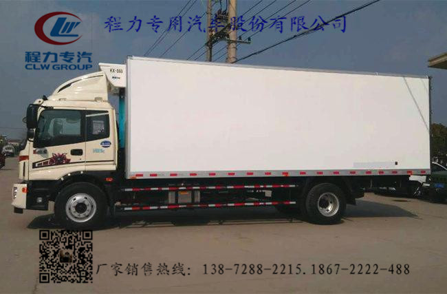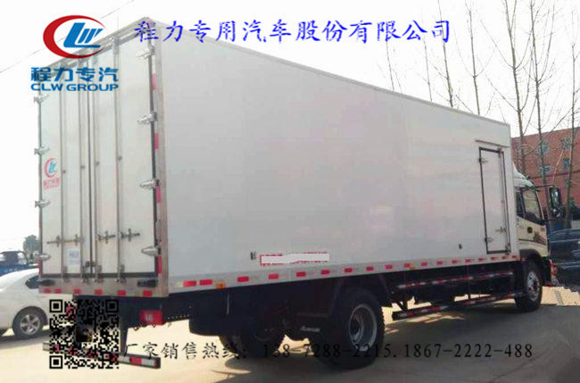 2.上裝配置:箱體內部有效尺寸:長7.55米×寬2.3米×高2.3米,廂體蒙皮內外玻璃鋼,隨客戶選擇內置槽鋼焊接骨架或者玻璃纖維超輕高強度骨架,填充8cm聚氨酯保溫層,不銹鋼包角,不銹鋼門框,不銹鋼門鎖件,防滑花紋鋁底板,配后雙開門,車廂右側可以加開側門,-5或者-18度國產非獨立制冷機組,可選裝合資獨立制冷機組或美國原裝進口獨立制冷機組,選裝T型材通風槽,肉鉤,導軌。該車非常適合改裝肉鉤冷藏車,不超重