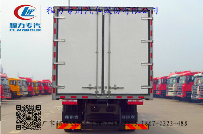 2.上裝配置:冷藏廂內部有效尺寸:長9.45米*寬2.35米高2.41米,冷藏廂體采用內外玻璃鋼,隨客戶選擇槽鋼焊接骨架或者玻璃纖維超輕高強度骨架,填充8cm聚氨酯保溫層,不銹鋼包角,不銹鋼門框,不銹鋼門鎖件,防滑花紋鋁底板,配后雙開門,-5~-18度制冷機組,車廂右側可以加開側門。