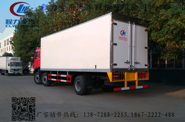 2.上裝配置:冷藏廂內部有效尺寸:長9.45米*寬2.35米高2.41米,冷藏廂體蒙皮采用內外玻璃鋼,隨客戶選擇槽鋼焊接骨架或者玻璃纖維超輕高強度骨架,填充8cm聚氨酯保溫層,不銹鋼包角,不銹鋼門框,不銹鋼門鎖件,防滑花紋鋁底板,加裝T型材通風槽,配后雙開門,車廂右側可以加開側門,-5~-18度國產非獨立制冷機組,選裝合資獨立制冷機組或者美國原裝進口獨立制冷機組,
