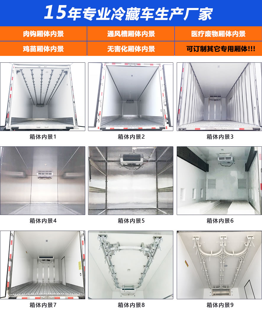 箱體采用三明治結構,內外采用冷藏車專用玻璃鋼(可反射陽光可選用不銹鋼),中間保溫層采用聚氨酯發(fā)泡隔熱材料,18米罐注一次成型,產品重量輕,漏熱率(導熱系數)低,強度高,保溫效果好,廂體美觀大方扎實耐用。廂體厚度8CM.廂體全為不銹鋼鎖件,鋁合金包角,廂體可選裝通風槽、開側門等。根據需要可選裝配國內外知名制冷機組(溫度達到保鮮或冷凍要求),可根據您的需求進行定制生產。