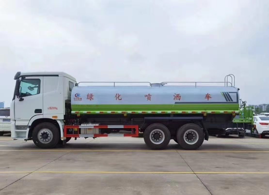 湖北程力國(guó)六歐曼后雙橋18-20方綠化噴灑車(灑水車)程力威牌CLW5250GPSBDP型綠化噴灑車廠家配置: 湖北程力國(guó)六福田歐曼GTL后雙橋20噸灑水車底盤配置:采用福田歐曼后雙橋原裝底盤,福田歐曼GTL豪華駕駛室,4400+1350mm軸距,搭載國(guó)六(國(guó)Ⅵ)東風(fēng)康明斯260馬力柴油發(fā)動(dòng)機(jī),功率191kw,國(guó)六排放,陜齒法士特八檔變速箱,11.00R20鋼絲胎,前橋5T,后橋雙10T,方向助力,斷氣剎,排氣制動(dòng),原裝空調(diào),行駛記錄儀,多媒體顯示屏,電動(dòng)門窗,中控鎖,氣囊座椅,ABS。 湖北程力國(guó)六福田歐曼GTL后雙橋20方灑水車專用配置:罐體容積:18立方米,罐體鋼板為5mm碳鋼Q235材質(zhì)專用容積板一次成型,罐內(nèi)隔板具有防波作用,以減輕汽車行駛時(shí)罐體液體沖擊;配大功率專用灑水泵,泵可自吸自排;整車前沖、后灑、側(cè)噴、后平臺(tái)帶綠化灑水炮,灑水炮可全方位旋轉(zhuǎn),可連續(xù)調(diào)成直沖狀、大雨、小雨、毛毛雨;前封頭帶水位計(jì),后平臺(tái)主管路帶1寸澆花接口,后爬梯,帶1個(gè)消防接頭,帶1個(gè)自流閥,1個(gè)過(guò)濾裝置。