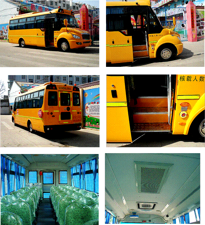 身: 空調(diào)內(nèi)飾、氣動折疊門、車外應(yīng)急開關(guān),左側(cè)安全門,下粘接上推拉側(cè)窗,手動倒車鏡,不銹鋼下視鏡、內(nèi)視鏡,安全衛(wèi)士監(jiān)控系統(tǒng)(硬盤錄像機+5探頭+倒車監(jiān)視)前組合燈具,后圓燈,4盞校車標示燈,GPS行車記錄儀(含MP3收音機)限速裝置,電瓶倉門,800天窗,45座(2+3)幼兒專用座椅(全車安全帶)/43座小學(xué)生座椅(配安全帶),整車普通漆、平地板(PVC地板革)無后行李倉,電、氣喇叭、電風(fēng)扇,電子鐘,小遮陽簾,滅火器2個、隨車工具,上車扶手,校車護欄,醫(yī)療急救箱、電動停車警示牌。